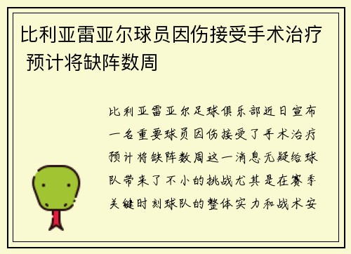 比利亚雷亚尔足球俱乐部近日宣布,一名重要球员因伤接受了手术治疗,预计将缺阵数周。这一消息无疑给球队带来了不小的挑战,尤其是在赛季关键时刻,球队的整体实力和战术安排都可能受到一定影响。本文将从四个方面对这一事件进行详细探讨,分别分析受伤球员的影响、手术治疗的过程与恢复期、球队如何应对球员缺阵的困境以及球员复出的前景。通过这四个角度,我们将更全面地理解比利亚雷亚尔在面对伤病困扰时的应对策略与前景。文章最后将对这一事件进行总结,展望球队未来的表现及球员康复后的状态。